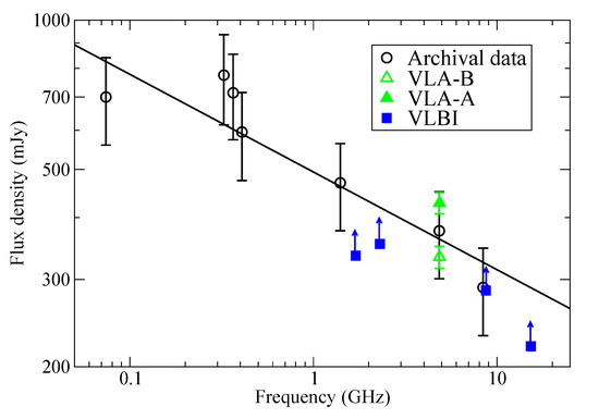 Radio spectrum of J1826+3431. Black circles are from archival measurements, their details are given in Table 5. Green triangles indicate the sum of modelfit components of the VLA measurements presented in this paper. Black line represents the power-law fit to the above total flux density points. Blue squares with arrows show the sum of modelfit components of high-resolution VLBI measurements from this paper, as lower limits to the total flux density. The selected VLBA epochs ( for and GHz, and for GHz) are the closest in time to the -GHz EVN measurement.
