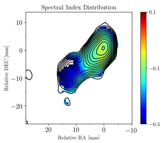 The simultaneous - and -GHz observations allow us to map the spectral index distribution of the mas-scale radio emission in J1826+3431 using VIMAP [36]. We present a spectral index image in Figure 6. We used our data from the epoch 2015.064. After using elliptical masks to exclude the cores from the images, we matched the - and -GHz maps of J1826+3431 by using two-dimensional correlation. Considering that the frequencies are relatively close to each other and that the measurements were performed at the same time, it was not necessary to shift the brightness peak. The spectral index image (Figure 6) suggests a flat-spectrum radio emission () in the core region and along the jet closer to the core. It is in good agreement with the spectral index calculated using the archival total flux density data (Figure 5) since the dominant emission feature of the source is the core. The spectrum gradually steepens further away from the core along the jet, as expected from optically thin synchrotron radio emission.