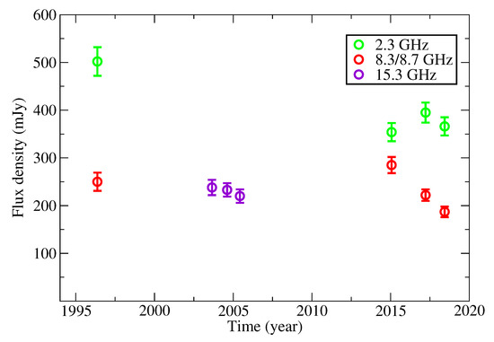 To characterize variability in the VLBI-detected features, we plot the sum of flux densities in the fitted Gaussian model components at different observing frequencies as a function of time in Figure 7. As can be clearly seen, especially for the 2.3- and 8.3/8.7-GHz data where the observations span more than two decades, the flux density of the source is strongly variable over time. Moreover, the variations in the difference of the 2.3- and 8.3/8.7-GHz flux density values suggest variability of the spectral index.