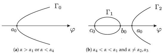 (1) If or , then via Lemma 1 we know that Equation (9) has four roots c, , and . The root c is a double real root. is a simple real root. and are two complex roots. From Figure 1a we see that on plane there is an open orbit passing the point . The open orbit possesses expression
