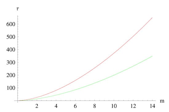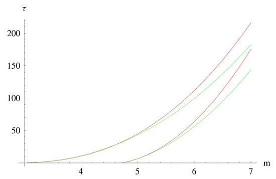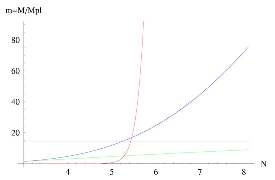 In the following we show diagrams, from Figure A1, Figure A2, Figure A3, Figure A4, Figure A5, Figure A6 and Figure A7, where we compare the various solutions in three cases: (a) Green lines: the standard Hawking emission, Equation (A35); (b) Blue lines: GUP emission only, Equation (A34), where the existence of a minimum mass appears clearly; (c) Red lines: the GUP emission (A33) which includes the phase space squeezing controlled by function . Below, we show two families of diagrams: the first for a mass threshold of and initial masses, respectively, of Planck masses; the second for a mass threshold of and initial masses, respectively, of Planck masses. Everywhere we assumed for the sake of simplicity.