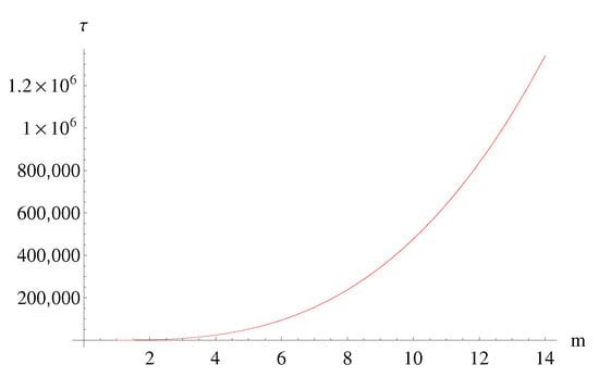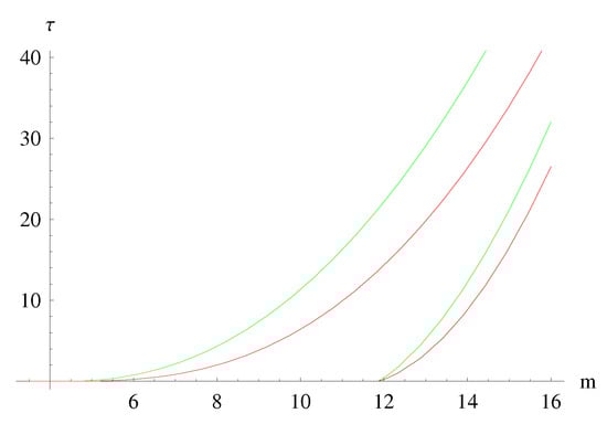 As it is clear from the mass–temperature diagrams (see Figure 1), black hole temperature is undefined for . Black holes with mass less than do not exist, since their horizon radius would fall below the minimum allowed length. The mass–temperature relations derived from the GUPs, hence, predict the existence of mass thresholds for the creation of micro black holes. A head-on collision of partons with a center-of-mass energy below (in Planck units) will not result in production of black holes (at least black holes as we define them today). It is interesting to compare the two diagrams of and as functions of the number N of space-like dimensions.