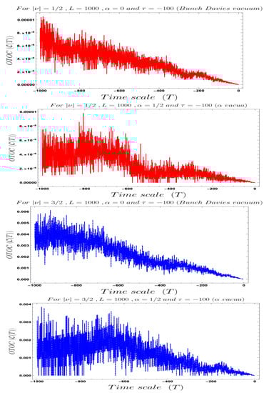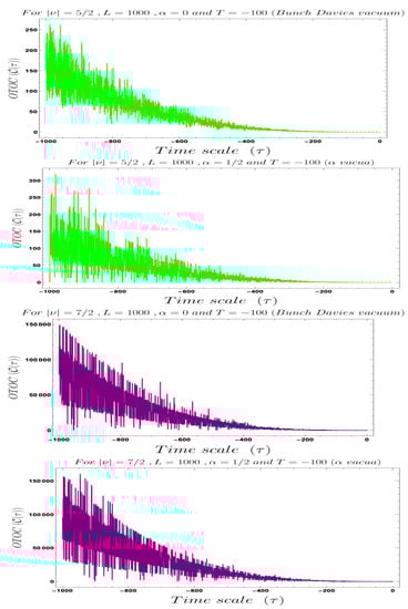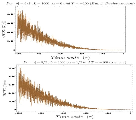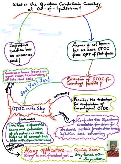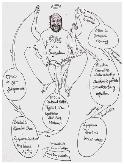 Now, we will talk about something very unusual from the perspective of applying the framework of the computation of OTOC in a completely different framework in which we are mostly interested in this paper. This is nothing but a cosmological application of OTOC from our own universe. Initially anyone can think that this is just a crazy idea and the final result will not give any physically relevant information regarding cosmological OTOC. We are completely ok with this initial thought. However, gradually once we proceed in this paper by detailed computation we will try to convince the general readers regarding the strong applicability of OTOC within the framework of Cosmology. Before going to discuss this feature in detail we will first start with some basic understanding from the study of Cosmology, which will surely helps to understand the background physical motivation of this crazy computation of OTOC in cosmological paradigm. In the quantum mechanical description of Cosmology, which is mostly used to describe the early universe physics the most significant quantity that we study are the N-point correlation functions of the cosmological scalar fluctuations or the tensor fluctuations or the mixture of them [,,,,,,,,,,]. These quantum fluctuations are originated from a geometrical and a very fundamental quantity of the study of Cosmology, which is the well known classical gravitational background metric. To describe the observationally relevant universe in the cosmological scales it is a very general practice to consider the Friedmann–Lemaître–Robertson–Walker (FLRW) background metric of our space-time which is an exact solution of Einstein’s field equations within the framework of the General Theory of Relativity and describes a homogeneous, isotropic and expanding universe. However, the most general solution of the metric contains an additional curvature parameter, which one can fix to be zero by considering the present to observational data obtained from various observational probes of Cosmology. So this implies that a spatially flat FLRW metric is sufficient enough to describe most of the observationally consistent aspects within the framework of Cosmology []. For this reason we will stick to this background metric only for the rest of the discussions of this paper. Using this metric one can study the cosmological perturbation theory from which one can explain the origin of previously mentioned scalar and tensor fluctuations, which are treated to be quantum to describe the physics of early universe and for the late time scale it is considered to be classical in nature. These quantum fluctuations are very fundamental objects in the context of Cosmology from which all N-point correlation functions can be computed in Fourier space and these results can be used to probe the physics of early universe as well as to comment on its impact on the present day galaxy and cluster formation in large scale structure non-linear cosmological perturbation theory. Apart from having a great understanding the computation of these correlation functions of the quantum fluctuations at thermodynamic equilibrium, we have until now have a lot of constraints and limitations from the observational probes. From cosmological observations until now we have information regarding the amplitude of the primordial power spectrum from scalar mode fluctuations (this is actually represent the amplitude of the cosmological two-point correlation function of scalar mode quantum fluctuations in Fourier space) [] and about its nearly scale invariance feature with respect to momentum scale (this constraint will helps us to determine the feature of the primordial power spectrum for scalar modes in all cosmological momentum scales. Until now from observational probes only the information regarding the spectral index (which is represented by the logarithmic derivative of the logarithm of the power spectrum at the cosmological horizon crossing scale) with high statistical accuracy is available. Any further information, such as running and the running of the running of the scalar spectral index are not available with any significant statistical accuracy). Additionally, we have information regarding upper bound on the tensor-to-scalar ratio (it represents the ratio of the amplitude of the power spectrum from tensor and scalar modes fluctuation and in terms of quantum description it represents the ratio of the two-point cosmological correlations. This is a very important observable in Cosmology the determination of which with high statistical accuracy will directly confirm the existence of gravitational waves in primordial cosmology and can also further able to fix the origin of primordial fluctuations by exactly determining the scale of inflation) at the cosmological horizon scale from the observational probes. No other information regarding the higher point (three and four-point etc.) cosmological correlation functions are available until now with significant statistical accuracy which can also be treated as the probe of new physical phenomenon through non-Gaussianity in the primordial Cosmology. This implies that just using the present observational probes one cannot able to distinguish amongst various possible origin of primordial quantum mechanical fluctuations and rule out models which describes inflationary paradigm within the framework of Cosmology. So, one can immediately ask about a questions regarding the possible options left to explore the physics of primordial quantum fluctuations: