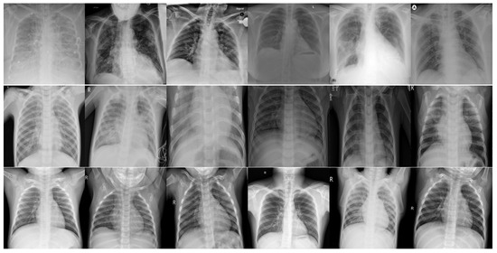 Image samples of the frontal chest X-ray scans. The first row shows X-ray images of COVID-19 patients, the second row shows X-ray images of patients with other types of viral pneumonia, and the third row shows X-ray images of normal cases, which represents the control group.