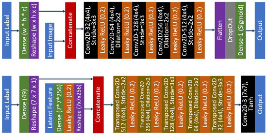The proposed conditional DC-GAN architecture that produces 224 × 224 synthetic images. The top image is the architecture for the discriminator network, while the bottom image is the architecture of the generator network.