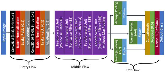 The exit flow is designed such that the features are extracted symmetrically from compact multi-scale layers that require low numbers of parameters. It is a simplified version of the spatial pyramid pooling module with three symmetrical down-pooling branches that follows a similar network flow as in the work by Abdani et al. [23]. It is a crucial step in improving the accuracy, which we proved later, as shown in the ablation study subsection—the features are sampled from three scales which provides better extracted features, knowing that the images are captured from various X-ray machines. The multi-scale down-pooling unit is used through a symmetrical network of average pooling operations with three different kernel sizes. Thus, the exit flow can be written as