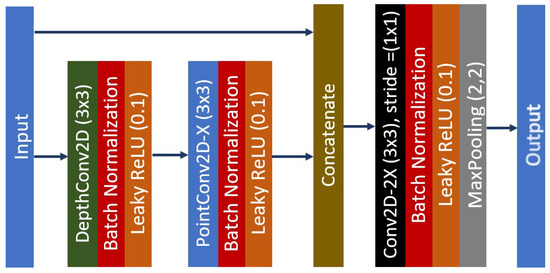 In each K, the number of filters in B is twice the number of filters in . The separable unit is a composite function of a depthwise and pointwise convolution, where batch normalization and leaky ReLU are applied after each operation. A maximum pooling operator is added at the end of K so that the feature maps will be downsampled for four times except for the last unit. Thus, the feature map at the end of the middle flow will have a reduced size by a factor 16 compared to its initial input size. Figure 6 shows the architecture of a single middle unit, where the total number of filters used can be found in Figure 5. Therefore, the middle flow can be represented by Equation (8).