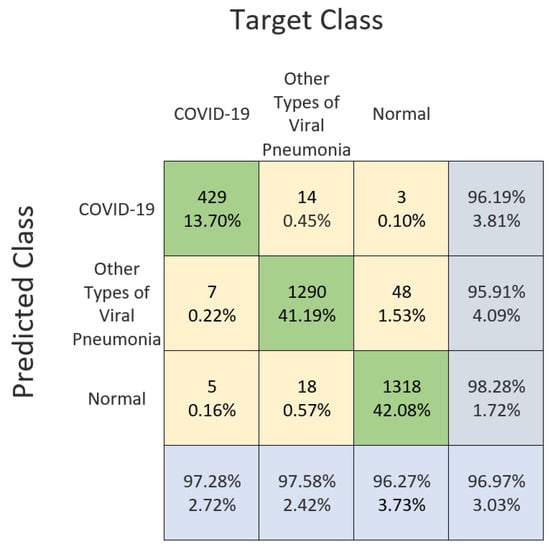 A compact LightCovidNet performed relatively stably in identifying all the three classes, as shown in the confusion matrix in Figure 9. This matrix details the experimental performance of the LightCovidNet; the true positive, false positive, and false negative cases are shown according to each respected class. The largest error happened when the model misclassified the normal cases to be the other types of viral pneumonia, and the second largest error occurred when the model misclassified the other types of viral pneumonia cases to be normal cases. Generally, LightCovidNet is a good classifier for COVID-19 screening; it correctly identified 429 cases out of 446, which is an accuracy of 96.19%. Only seven cases of the COVID-19 images were wrongly identified as the other types of viral pneumonia cases, while only five cases were wrongly identified as normal cases. Thus, the screening rate of LightCovidNet is very high, which is 97.28%, which makes it suitable to be implemented as a mass screening tool.