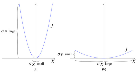 Intuitively, the content of the uncertainty principle is, in the present model, that the product of the standard deviations has a lower bound in terms of the stationary distribution due to the covariance. If one would like to have a small standard deviation for the position, one would need to have a rather steep value function in order to constrain and confine the particle within a small location in terms of the stationary distribution (due to the exponential structure of the Gibbs distribution). A steep and a localized value function would then imply a large standard deviation for the gradient of the value function. There is then a natural tradeoff between the localizations of four-position and four-momentum (Figure 1). The key is the gradient structure of the stochastic process, where the test particle tries to seek a minimum for the value function as in a “gradient search”.