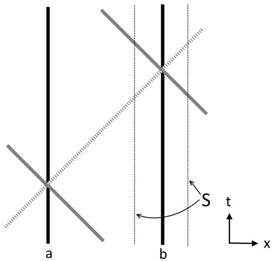 The destructive interference we refer to above is similar to the classical process of absorption discussed in Section 3.1.4, dealing with photons, but with one critical difference: There, the destructive interference between the incident retarded field and the secondary retarded field, generated by the absorbing system, entails the excitation of that system in order to respect energy-momentum (e-m) conservation. In the current case, the incident retarded field superposes destructively also with the advanced field of the absorbing system (see Figure 3). This destructive interference guaranties that the Poynting flux across a sphere, S, containing the absorbing system (or, as it should more appropriately be called in this case: the reacting system), vanishes, respecting its equilibrium with the ZPF. Reversing the roles of advanced and retarded fields, the advanced field of system b is likewise absorbed by system a. At the level of equilibrium with the ZPF, the arrow-of-time is inconsequential.