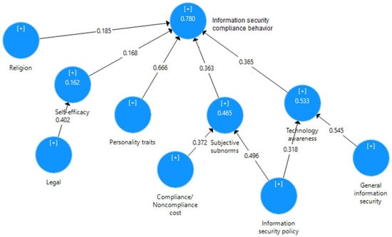 Partial least squares (PLS-SEM) was used to test the dimensions and identify the path coefficients (Figure 1). According to the requirements for approving the dimensions of the theoretical model, three values must be within the standards, namely the t-values (path coefficients), significance, and goodness of fit. Since the t-values of dimensions were greater than 1.96, they were deemed to be the main valid dimensions of ISCB. As mentioned by Kim et al. [17] and Chin et al. [34], the best goodness of fit for any model in PLS-SEM should be classified as low, middle, or high. The ranges for each category are 0.02 0.13, 0.13 0.26, and above 0.26 for the low, middle, and high forecasting goodness of fit, respectively. High-ranging R squared values of the present theoretical model were observed in the influence of personality traits, followed by technology awareness, subjective norms, general information security, information security policy, legal punishment, and compliance/noncompliance cost. Mid-level R squared values were observed for the effect of self-efficacy and religion on ISCB. The overall goodness of fit for this model achieved about 78% (R squared = 0.780), as shown in Figure 1. Therefore, this model is considered to meet the requirements for employee ISCB in Saudi Arabia. Additionally, statistical validity was performed by using confirmatory and exploratory factor analysis. Cronbach’s alpha was used to determine the internal consistency of questions and variables as one set. Reliability values were found to be 0.942 for ISCB, 0.937 for subjective norms, 0.901 for self-efficacy, 0.868 for religion and morality, 0.876 for personality traits, 0.893 for general information security, 0.984 for information security policy, 0.866 for legal consequences/punishment, 0.789 for the perceived cost of compliance/non-compliance, and 0.858 for technology awareness. The overall Cronbach’s alpha for the survey was 0.936. After factor analysis was conducted, sixty-two survey items were retained across domains. They were distributed as follows: 9 on religion/morality, 8 on legal consequences/punishment, 10 on the Big-Five personality traits, 9 on ISCB, 10 on self-efficacy, 4 on subjective norms, 3 on the cost of compliance/non-compliance, 3 on general information security, 2 on information security policy, and 4 on technology awareness.