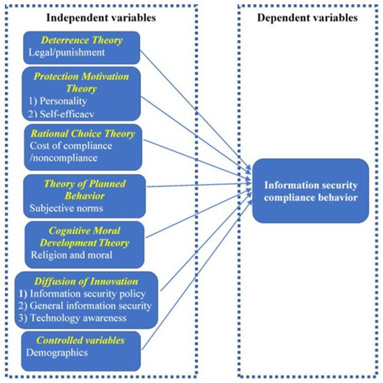 However, the present study aimed to identify the impact of other non-common variables, such as religion, punishment, and personality traits, alongside the common theories. Figure 2 depicts the influence of independent and moderator variables (as identified by existing theories) on the dependent variable. The study’s independent and moderator variables include legal consequences/punishment (GDT), personality traits and self-efficacy (PMT), cost of compliance/non-compliance (rational choice theory (RCT)), subjective norms (TPB), religion and morality (cognitive moral development theory), and information security policy, general information security, and technology awareness (DOI). Demographic characteristics were the only controlled variable.