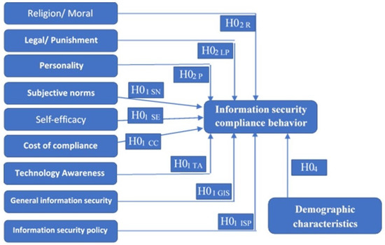 As shown in Figure 3, null hypotheses concerning religion/morality, legal consequences/ punishment, and personality traits are abbreviated as H02R, H02LP, and H02P, respectively. Null hypotheses concerning subjective norms, self-efficacy, cost of compliance/non-compliance, technology awareness, general information security, and information security policy are abbreviated as H01SN, H01SE, H01CC, H01TA, H01GIS, and H01ISP, respectively. Hypothesis 3 relates to moderators, and Hypothesis 4 refers to the effects of demographics on ISCB.