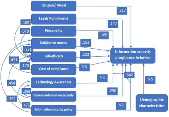 Models have previously been formulated to detect and manage violations of information security systems. They have been implemented to identify factors commonly associated with the weaknesses of healthcare systems, such as technical problems, personal problems, security architecture, information security governance, and business and recovery planning [35,36,37]. Several Saudi studies have attempted to determine the factors influencing information security systems, especially those related to employee behavior, but were either categorized as review studies or deemed methodologically insufficient [38,39]. This paper aims to bridge this research gap by formulating an integral model of the broad dimensions influencing ISCB among employees at governmental healthcare centers in Arar City, KSA. Some scholars have highlighted the influence of psychological parameters on the protection of information technology systems at hospitals [9]. However, these psychological parameters vary in nature based on type, severity, risk, and the relationship to violation of information security of healthcare professionals at medical institutions. All of these variables are particular to the requirements of specific theories and policies when creating models of ISCB. Kim et al. [17] proposed a hybrid model derived from four theories: TPB, RCT, naturalization theory, and PMT. Along those lines, the present study examines several dimensions that directly and indirectly affect ISCB among healthcare employees in the KSA. Moreover, the country’s unique culture has impacted employees’ psychological and information security behavior in domains such as religion, personality, and commitment to legal consequences [12]. The proposed model constitutes a novel addition to the literature, especially as it combines psychological, technical, management, and cultural parameters involved in ISCB. Kim et al. [17] proposed self-efficacy as one of the variables that may be influenced by ISCB. However, they found no significant impact of self-efficacy on ISCB. The present study demonstrates a significant impact of self-efficacy on ISCB, with better association results ( = 0.223) than their outcome. The value of self-efficacy in the present study is similar to previous outcomes [31]. The controversial results about the impact of self-efficacy on information security behavior are probably due to the inconsistency of the definition, use, and measurement of the level of self-efficacy and the method of evaluating the relationship within the context of security behavior [40]. For this reason, the present study passes through several precise methodological and validation steps to define the items and scales of self-efficacy. Klein et al. detected the relationship between punishment severity and security behavior. Unfortunately, although they stated the importance of punishment and severity, no significant relationship could be observed [41]. Ryutov et al. [9] noticed the substantial association between severity of punishment and security compliance behavior, with a regression coefficient of 0.132. Remarkably, the present study reveals a significant association between punishment/legal predictor and ISCB, almost similar to the outcomes obtained by [9]. Therefore, punishment/legal concerns are considered as an exclusive result, and a new domain should be considered when conducting future research, especially in the context of Saudi Arabian culture. A previous study found that religious and moral factors are strong predictors of commitment to self-improvement and personal behavior [42]. Bansal et al. also found an association between the non-compliance of employees with religious/moral beliefs, where a significantly negative relationship was observed between negative compliance and high levels of morality/religiosity. Kurpis et al. found that the standardized coefficient, implying the strength of the relationship, of the religiosity factor significantly influenced the intention and compliance behavior, with a value of 0.234 [42]. This result is in line with the outcomes of the present study, where the regression standardized coefficient ( = 0.217) is significantly influenced by the ISCB of healthcare employees of the governmental hospitals and clinical centers in Arar, KSA. This outcome is considered to answer many researchers’ questions concerning the impact of religion/moral beliefs on the information security behavior of healthcare workers, particularly in countries with specific environments like that of the KSA [12]. Establishing the significant relationship between religion and security behavior is considered as another novelty of the present study, as this new dimension (religion/morality) should be considered in future studies conducted in the KSA. The assessment of personality has received the attention of several researchers, especially regarding its relationship with information security and social behavior. Vance et al. confirmed this association and the impact of personality on the failure or success of employees at protecting patients’ confidential information. Moreover, they attributed the influence of personality to protection motivation and habit theories [43]. All studies conducted in Saudi Arabia lacked a systematic and broad view of the common domains that influence the culture, such as personality traits, which may differ in each region of the country, or from nearby countries [12]. This privileged the present study to highlight the common psychological and habitual parameters that influence behavior in Saudi Arabian culture. Kim et al. [17] categorized subjective norms as one of the three social psychological parameters, in addition to attitude and perceived control, which influence information security behavior within planned action and behavior theory. Subjective norms, as reported by a previous study, encourage someone to do certain things under pressure, which reveals the extent of compliance to rules [44]. Ryuto
