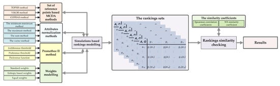 The study aims to analyze the similarity of rankings obtained using the selected four MCDA methods. It should be noted that in research, we analyze this problem only from the technical (algorithmic) point of view, leaving in the background the conceptual aspects of the method and the systemic assumptions of obtaining model input data. For each of these methods using a simulation environment, several rankings were calculated. The simulation itself was divided into two parts. The first part refers to a comparison of the similarity of the results separately for TOPSIS, VIKOR, COPRAS, and PROMETHEE II. In the second part, these methods were compared with each other. As illustrated in Figure 1), the calculation procedure took into account different normalization methods, weighting methods, preference thresholds, and preference functions. Thus, in the case of the TOPSIS method for each decision matrix, 12 separate rankings were created, where each of them is a different combination of a standardization method and a weighing method. Then, for the same matrix, a set of rankings using other MCDA methods (VIKOR, COPRAS, and PROMETHEE II) was created respectively. This procedure was repeated for different parameters of the decision matrix (in terms of the number of analyzed alternatives and number of criteria). In this way, the simulation provides a complex dataset in which similarities were analyzed using the Spearman and WS coefficients.
