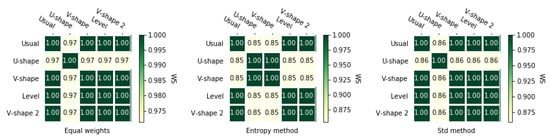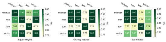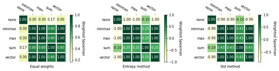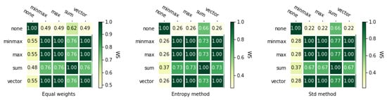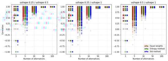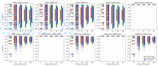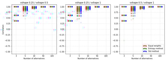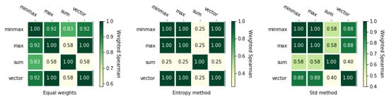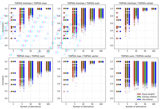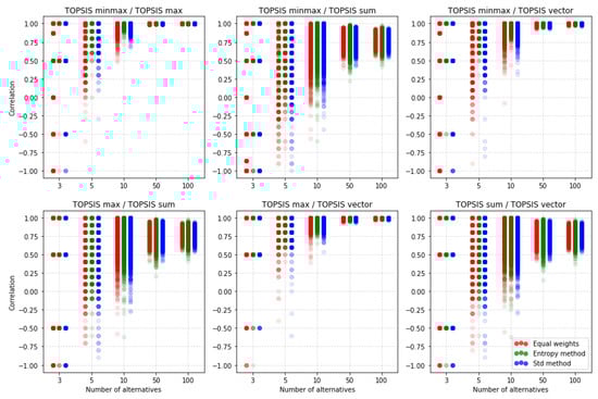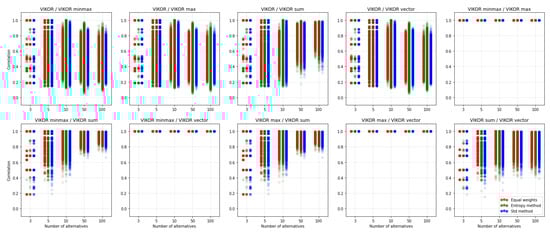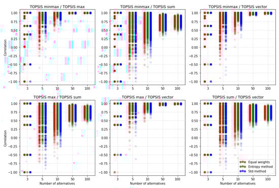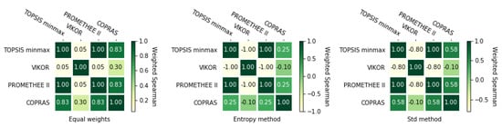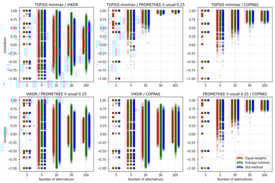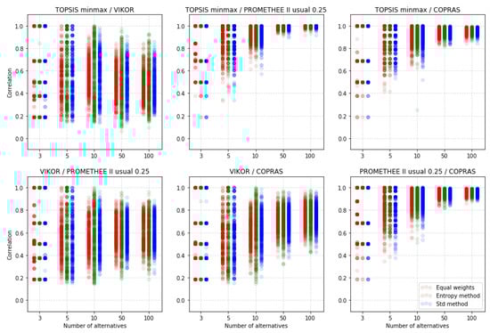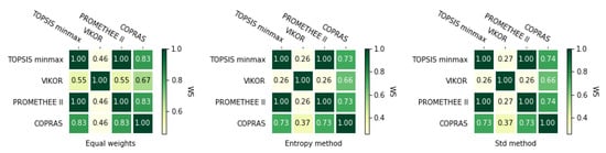 In this paper, we used several MCDA methods (TOPSIS, VIKOR, COPRAS, and PROMETHEE II) to make comparative tests. The choice of this set was dictated by the properties and popularity of these methods. These methods and their modifications found an application in many different domains such as sustainability assessment [34,35,36], logistics [37,38,39], supplier selection [7,40,41], manufacturing [42,43,44], environment management [45,46,47], waste management [48,49], energy management [50,51,52,53,54,55], chemical engineering [56,57,58], and many more [59,60]. The choice of a group of TOPSIS, VIKOR, and COPRAS methods is justified, as they form a coherent group of methods of the American MCDA school and are based on the same principles, using the concepts of the so-called reference points. At the same time, unlike other methods of the American school, they are not merely trivial (in the algorithmic sense) elaborations of the simple additional or multiplicative weighted aggregation. The choice of the PROMETHEE II method was dictated by the fact that this method belongs to the European school and that the PROMETHEE II algorithm implements the properties of other European school-based MCDA methods (outranking relations, thresholds, and different preference functions). It should be noted that for benchmarking purposes, the choice of this method has one more justification—unlike other methods of this school, the method provides a full, quantitative final ranking of decision-making options.
