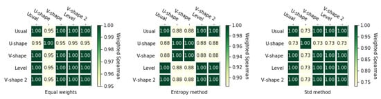 The publication of Zanakis et al. [29] presents results of benchmarks for eight MCDA methods (Simple Additive Weighting, Multiplicative Exponential Weighting, TOPSIS, ELECTRE, and four AHP variants). In the simulation test scenario, randomly generated decision problems were assumed in which the number of variants was equal: 3, 5, 7, and 9; the number of criteria were: 5, 10, 15, and 20; and the weights of the criteria could be equal, have a uniform distribution in the range <0; 1> with a standard deviation of 1/12, or a beta U-shaped distribution in the range <0; 1> with a standard deviation of 1/24. Moreover, the assessments of alternatives were randomly generated according to a uniform distribution in the range <0; 1>. The number of repetitions was 100 for each combination of criteria, variants, and weights. Therefore, 4800 decision problems were considered in the benchmark (4 number of criteria × 4 number of variants × 3 weightings types × 100 repetitions) and 38,400 solutions were obtained in total (4800 problems × 8 MCDA methods). Within the tests, the average results of all rankings generated by each method were compared with the average results of rankings generated by the SAW method, which was the reference point. Comparisons were made using, among others, Spearman’s rank correlation coefficient for rankings.