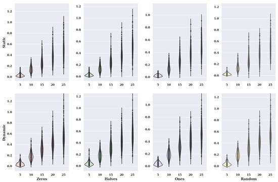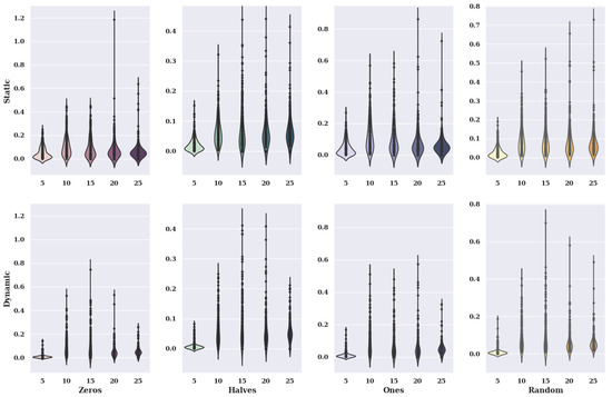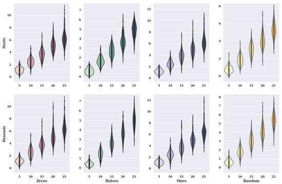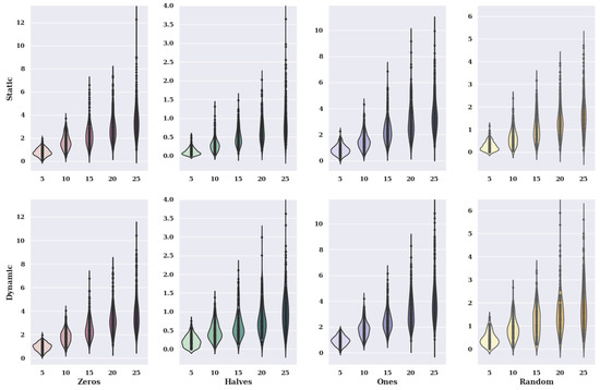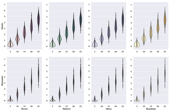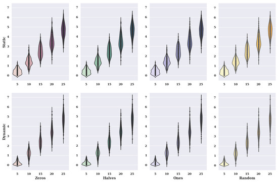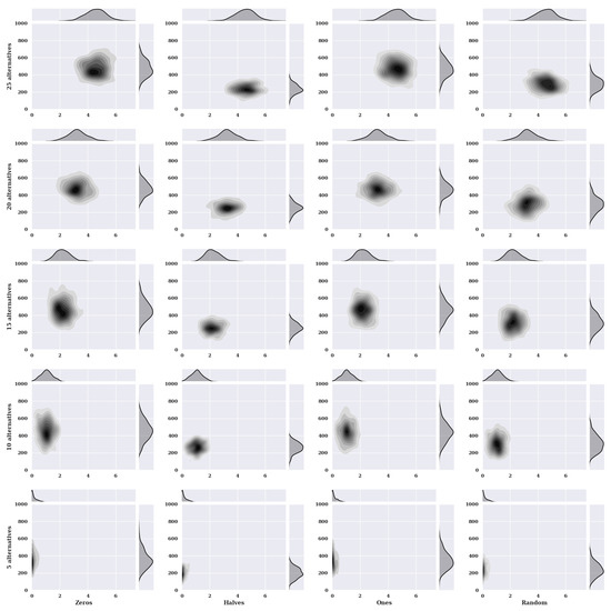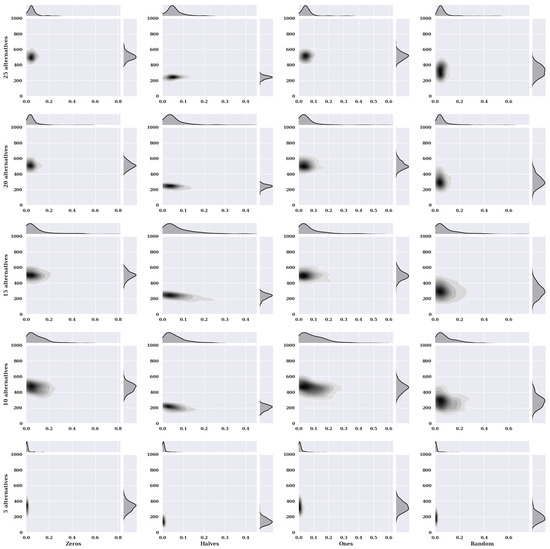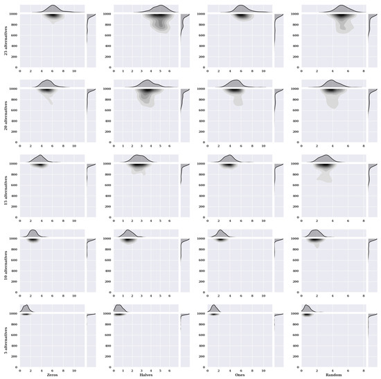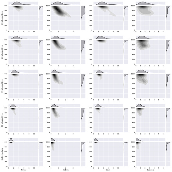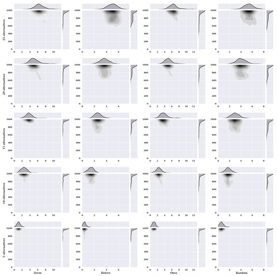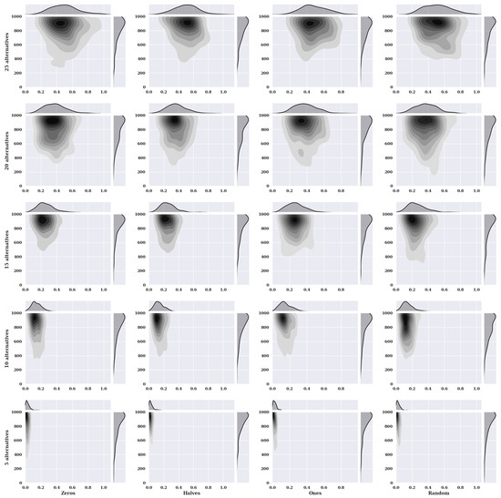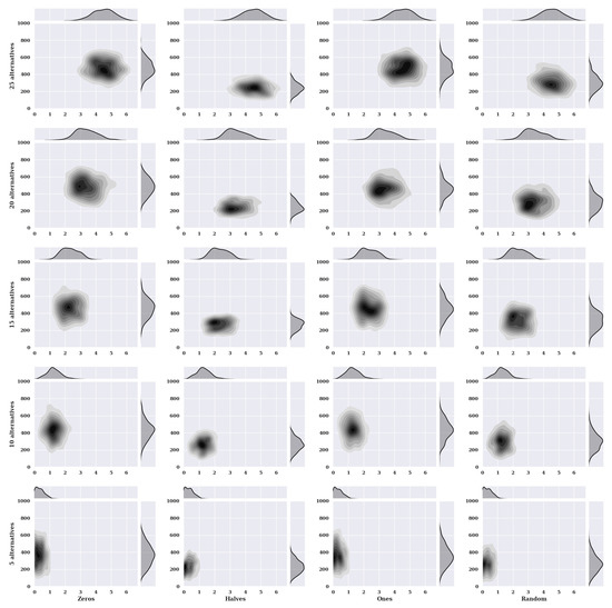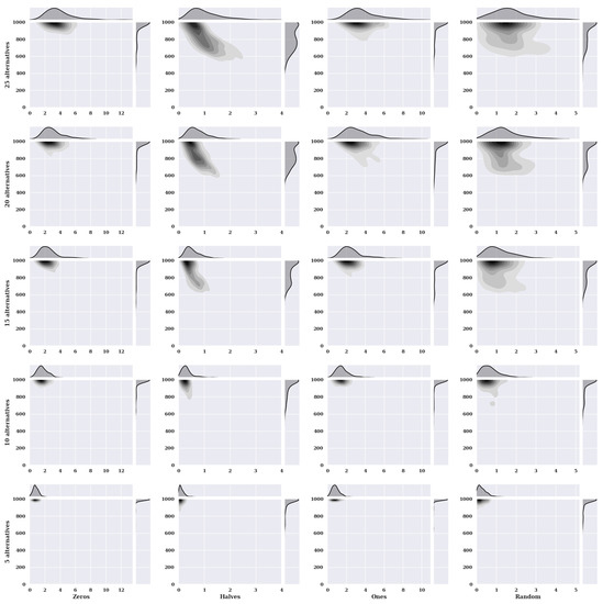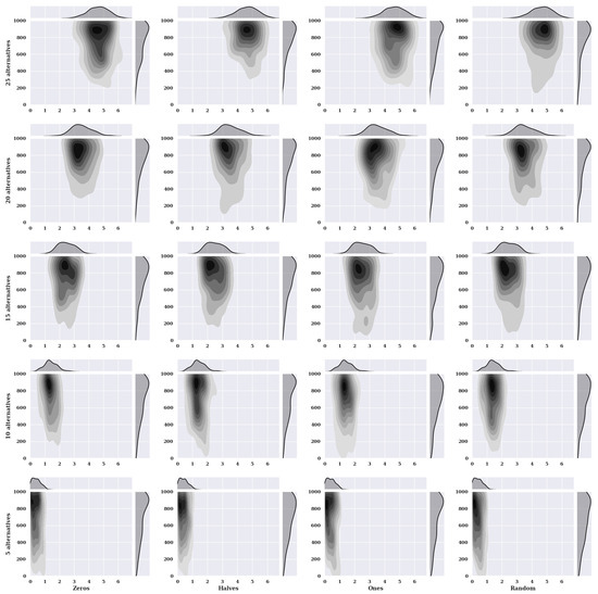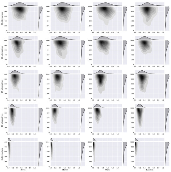 Figure 2 presents heat maps with nuclear density estimators for a hill-climbing algorithm for a static variant of criteria with a non-existent model, i.e., one in which the preferences of the alternatives were selected randomly. The charts show the solutions found about the number of iterations for the given number of alternatives in the set and the initial state variants.