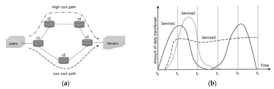 A cloud system can use the network resources of various paths to deliver the desired content to the user. If highly effective network resources with low cost are first allocated to a flow that consumes a large amount of network resources, the user QoE can be significantly improved. Figure 2 shows an example of a cloud network topology with two different network cost paths and three service flows with a dynamically changing the amount of data transmitted. The cloud system shown in Figure 2a has two different paths between the user and server. It is assumed that the s1-s3-s5 path is less costly than the s1-s2-s4-s5 path and can support only a single service flow. Figure 2b shows the size of the data transmission required when processing the three services. In this scenario, if the cloud network is configured using a traditional network structure, the network resources cannot be dynamically allocated according to the amount of data. Therefore, in the traditional network structure, when Service1 is first requested, it is transmitted through the s1-s3-s5 path and the remaining services are transmitted through the s1-s2-s4-s5 path. At this time, when the network utilization is analyzed over time, Service1 is considered to effectively transmit most of the data in the t0-t1 section, thus using the path efficiently. However, in the t1-t2 section, Service2 is transmitting most of the data but cannot use the low cost path. In the t2-t3 section, Service1 transmits hardly any data, whereas Service3 steadily transmits data, leading to a sharp decrease in network utilization. Consequently, in a traditional network structure, network resources cannot be efficiently used because they cannot be dynamically allocated according to the amount of data transmitted.
