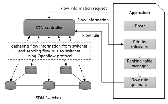 The proposed method manages resources efficiently at the network level when providing services in a cloud environment. Figure 3 shows the proposed system structure for efficient network resource management. As the figure indicates, the SDN controller is periodically notified regarding the amount of data and the number of packets transmitted. The information collected by the SDN controller is sent to the priority calculator, which uses it to calculate the weight of the flows. The ranking table manager sorts and stores the flows by priority based on the calculated weight. It then determines the network path of the flow using the set threshold. The ranking table manager continues to update and store the priority of the services. The flow rule generator creates a flow rule by setting the differential network paths for the services after checking the ranking table. The generated flow rule is sent back to the controller, which sends it to the switch through the Openflow protocol. Finally, each switch forwards packets based on the updated flow rule.