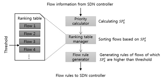 Figure 4 shows the procedure for allocating the network path based on the priority through the ranking table in the application. The controller periodically calculates and forwards it to the ranking table. The ranking table then manages the collected flows by sorting them based on . It then applies a threshold for differential network path allocation. This threshold can be set differently depending on the characteristics of the service and is used as the criterion for allocating efficient network paths in the SDN.