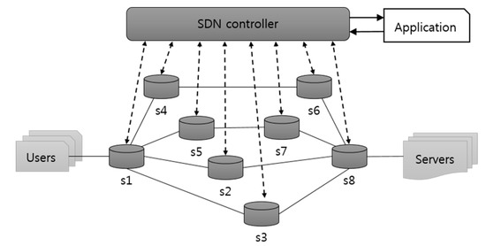 If the traffic pattern changes are detected in real time and paths are dynamically allocated using the SDN structure, network resources can be more efficiently managed. The SDN structure enables the changes in the amount of data transmitted by each service flow to be identified in real time. Thus, it can dynamically allocate the most efficient network resources to the service flow that transmits the most data per unit time according to the amount of data transmission identified. If the SDN structure is adopted in the above example, the s1-s3-s5 network path can be switched and allocated to Service1, Service2, Service3, Service1, and Service3 per unit time. In this manner, the network efficiency continues to increase, thereby increasing the user’s QoE. However, we should accurately predict the changes in flow arising from various factors to obtain such results. Therefore, in this study, we propose a method for more precisely detecting and processing the flow changes in an SDN structure.