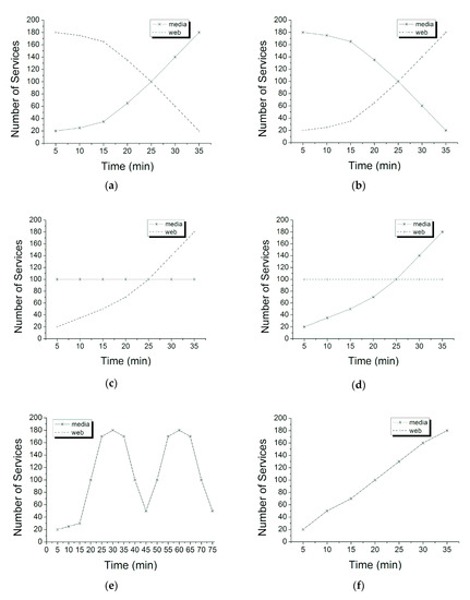Figure 6 shows the data workloads used for the experiment, which have six workload types. Each workload represents the number of multimedia and web services requested over time. In the figure, the amount of data for multimedia and web services is the same for both Workload-E and the Workload-F. In this study, we evaluated the performance of the six workload types in the experiments. These experiments aim to verify how much data traffic is transmitted through optimal paths by efficiently allocating the network resources to the service flow. For performance comparison, we also implemented the OSPF, which is the most commonly used in the conventional path selection algorithms. Many researchers have investigated its performance in the SDN environment [12,13] and compared their proposals with the OSPF [14]. In our study, we also evaluate the OSPF and compare it with our proposed algorithm.