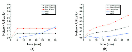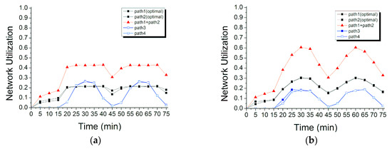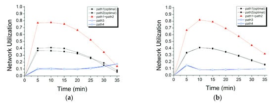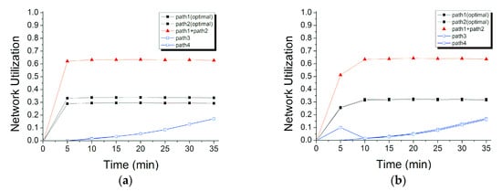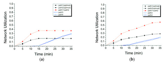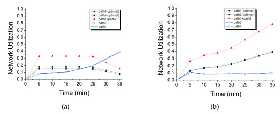 In the experiments, we set the weighting factor α of our proposed method as 0.5. We also update the ranking table every 5 min and distribute the flow rules to the switches at the same frequency. Figure 7 shows the performance evaluation results for Workload-A in which the multimedia services increase and the web services decrease. The vertical axis indicates the network utilization, and the horizontal axis indicates the flow of time in minutes. The network utilization is the amount of data sent divided by the maximum amount of data that can be sent through the optimal paths. This shows how many data are sent through the network paths. In the experiments, up to 120 flows can be sent through the optimal paths and the measurement interval is 5 min. Therefore, the maximum amount of data that can be sent through the optimal paths over the past 5 min is the sum of the amount of data in the top 120 flows based on the amount of data that enters during the corresponding amount of time. If the sum of the network utilizations of the optimal paths is 1, it indicates that all of the top 120 flows are assigned to the optimal paths. In the graph, the empty-blue-square line represents the results of paths 3 and 4 with long hop counts. The solid-black-square line represents the network utilization of the data transmitted through paths 1 and 2, which are optimal paths owing to the small number of hops. The solid-red-triangle line represents the sum of the amount of data transmitted through paths 1 and 2, and shows how much data flows through the optimal paths. If this value is 1, it indicates that the maximum amount of data that could be sent through the optimal paths was actually sent through those paths. The results confirm that the network utilization of paths 1 and 2 gradually decreases over time for the OSPF algorithm. Meanwhile, the utilization of paths 1 and 2 increases over time for the proposed algorithm. In the experiments, a total of 200 services were requested. At the first 0–5 min, the numbers of flows for multimedia services and web services were 20 and 180, respectively. Thus, many flows for the web services were allocated to optimal paths (paths 1 and 2) in the beginning. In this situation, the OSPF does not change the flows allocated to the optimal paths even though the number of flows for the multimedia services, which have a large amount of data transmitted, increases over time. In contrast, the proposed algorithm dynamically reallocates the paths based on the continuously checked priority of the flows. It lowers the priority of the web flows when new multimedia flows enters. Therefore, it changes the flows allocated to the optimal paths from the web services to the multimedia services when new multimedia services come in, thus leading to an increase in the efficiency in terms of network usage as shown in Figure 7b.