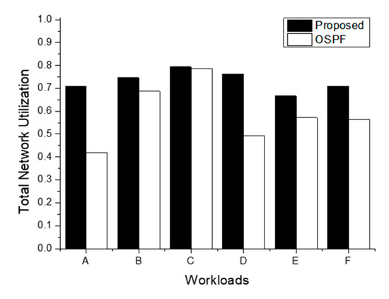 Figure 13 shows a graph of the total network utilization during the entire experiment time. The total network utilization refers to the amount of data transmitted through paths 1 and 2 divided by the maximum amount of data that can be transmitted for each workload. The results show that the total network utilization of the proposed algorithm is 29.4% higher than that of OSPF on average. The proposed algorithm shows 69.2% higher utilization than OSPF on Workload-A and 1% higher on Workload-C. Workload-A starts with 180 web services sending a relatively small amount of data and 20 multimedia services sending a relatively large amount of data. The number of flows of web services decreases and the number of flows of multimedia services increases gradually over time. In this situation, OSPF mostly assigns the web flows to the optimal paths in the beginning and does not replace them with the incoming multimedia flows. In contrast, the proposed algorithm reallocates the optimal paths assigned to the earlier web flows to the new multimedia flows. As a result, the proposed algorithm provides much better performance than the OSPF. The situation is slightly different on Workload-C. On that workload, the number of multimedia flows is initially 100 and does not change over time. Whereas, the number of web flows starts at 20 and grows to 180 over time. In this situation, both the OSPF and the proposed algorithm assign the optimal paths to the multimedia flows and do not replace them even though the number of web flows increases. Therefore, there is little difference in network utilization on Workload-C. In summary, the proposed algorithm shows higher performance than the OSPF on all workloads. As a result, the network resource management method proposed in this paper is clearly more effective than the OSPF.