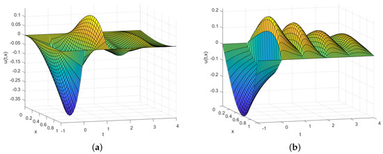 As shown in Theorem 3, the analytic–numerical solutions proposed in this work may provide numerical approximations with a-priori prescribed errors in bounded domains. The error bounds given in Theorem 3 for the first two terms, and , depending on gamma incomplete functions, are essentially exponentially decaying with N; and the third term, , is . As was shown in [13], the rate of convergence can also be made exponential for this last term, by using suitable polynomial approximations to the initial function. In any case, the error bounds guaranteed by Theorem 3 are usually far from being sharp, and convergence can be much faster, especially for problems with highly regular initial functions. Additionally, when the initial function consists of a finite combination of the eigenfunctions , the exact solution defined in Theorem 2 reduces to a finite sum.