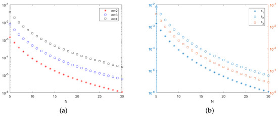 Maximum error bounds (log-scale) for numerical solutions of Example 1 for , with , in terms of N. (a) Error bounds for different m values. (b) Individual contributions to total error bound, for , of the first (), second (), and third term () in (56), with different scales for the first two terms (left axis) and the third term (right axis).