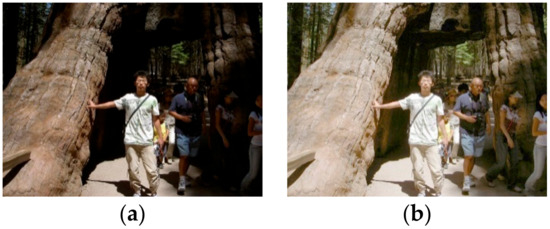 Local enhancement methods take the spatial distribution of pixels into account and usually have a better effect. Adaptive histogram equalization (AHE) achieves a better contrast by optimizing local image contrast [15,16]. By limiting contrast in each small local region, contrast-limited adaptive histogram equalization (CLAHE) [17,18] can overcome the problem of excessive noise amplification of the AHE. In [19], a scheme for adaptive image-contrast enhancement is proposed based on a generalization of histogram equalization by selecting an alternative cumulative distribution function. In [17], a dynamic histogram equalization method is proposed by partitioning the image histogram based on local minima before equalizing them separately. However, these methods often cause artifacts. Retinex theory [20] decomposes an image into scene reflection and illumination, which provide a physical model for image enhancement. However, early Retinex-based algorithms [21,22,23] generate enhanced images by removing estimated illumination so that final images look unnatural. Researchers have found that it is better to compress the estimated illumination rather than removing it [24,25,26,27,28]. The naturalness-preserved enhancement algorithm (NPEA) [24] modifies illumination by the bi-log transformation, and then combines illumination and reflectance. In [26], a new multi-layer model is proposed to extract details based on the NPEA. However, the computation load of these models is very high because of patch-based calculation. In [29], an efficient contrast enhancement method, which is based on adaptive gamma correction with weighting distribution (AGCWD), improves the brightness of dimmed images via traditional GC by incorporating probability distribution of luminance pixels. However, images enhanced by AGCWD look a little dim. In [30], a new color assignment method is derived which can fit a specified, well-behaved target histogram well. In [31], the final illumination map is obtained by imposing a structure prior to the initial estimated initial illumination map and enhancement results can be achieved accordingly. In [32], a camera response model is built to adjust each pixel to the desired exposure. However, the enhanced image looks very bright, perhaps resulting from the model’s deviation. Some fusion-based methods can achieve good enhancement results [33,34]. In [33], two input images for fusion are obtained by improving luminance and enhancing contrast from a decomposed illumination. In [34], a multi-exposure fusion framework is proposed which blends synthesized multi-exposure images from the proposed camera response model with the weight matrix for fusion using illumination estimation techniques.