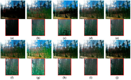 Images of “Tree” enhanced by different methods. (a) Original “Tree” image; images enhanced by (b) NPEA [24], (c) FHHS [30], (d) MF [5], (e) BIMEF [34], (f) NPIE [26], (g) LIME [31], (h) LECARM [32], and by proposed methods based on (i) QCFs (2) and (j) QCFs (3), respectively.