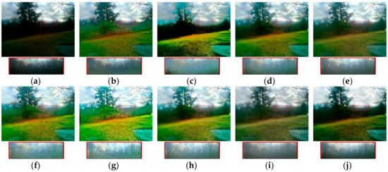 Images of “Grass” enhanced by different methods. (a) Original “Grass” image; images enhanced images by (b) NPEA [24], (c) FHHS [30], (d) MF [5], (e) BIMEF [34], (f) NPIE [26], (g) LIME [31], (h) LECARM [32], and by proposed methods based on (i) QCFs (2) and (j) QCFs (3), respectively.
