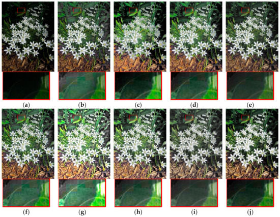Enhanced images for “Flower” by different methods. (a) Original “Flower” image; images enhanced images by (b) NPEA [24], (c) FHHS [30], (d) MF [5], (e) BIMEF [34], (f) NPIE [26], (g) LIME [31], (h) LECARM [32], and by proposed methods based on (i) QCFs (2) and (j) QCFs (3), respectively.