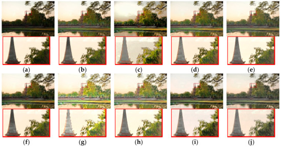 Enhanced images for “Tower” by different methods. (a) original “Tower” image; enhanced images by (b) NPEA [24], (c) FHHS [30], (d) MF [5], (e) BIMEF [34], (f) NPIE [26], (g) LIME [31], (h) LECARM [32], and by proposed methods based on (i) QCFs (2) and (j) QCFs (3), respectively.