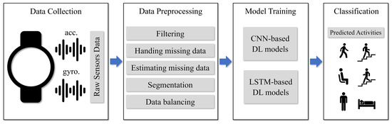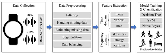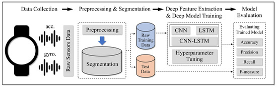 In this section, the proposed framework for hand-oriented activity recognition based on smartwatch sensor data is presented. The overall process of the framework is depicted as Figure 3.