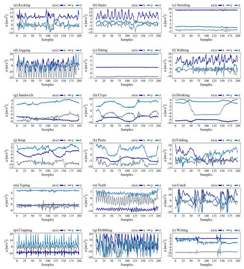 Activity accelerometer data for 10 s of (a) kicking, (b) stairs, (c) standing, (d) jogging, (e) sitting, (f) walking, (g) sandwich, (h) chips, (i) drinking, (j) soup, (k) pasta, (l) folding, (m) typing, (n) teeth, (o) catch, (p) clapping, (q) dribbling, and (r) writing.