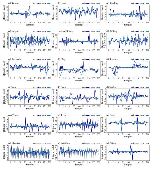 Activity gyroscope data for 10 s of (a) kicking, (b) stairs, (c) standing, (d) jogging, (e) sitting, (f) walking, (g) sandwich, (h) chips, (i) drinking, (j) soup, (k) pasta, (l) folding, (m) typing, (n) teeth, (o) catch, (p) clapping, (q) dribbling, and (r) writing.