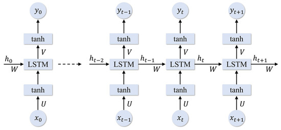 LSTM is an extended deep learning model of recurrent neural networks (RNN) [30]. LSTM is proposed to tackle vanishing and exploding gradient problems [31]. The computational process of the LSTM network can be detailed as the following process: (1) any input data X = {, , , …, , , …} is turned into the data together with the data of the hidden layer at the last stage to the hidden layer H = {, , , …, , , …} by the matrix transformation technique, and (2) the hidden layer output passes under an activation function to the last value of the output layer Y = {, , , …, , , …} as illustrated in Figure 7.