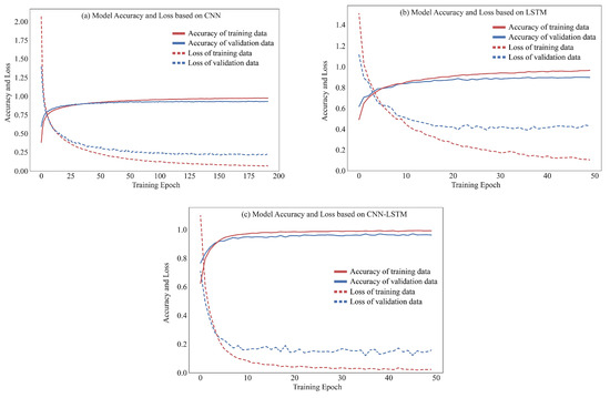 Accuracy and loss examples of the training process of (a) CNN, (b) LSTM, and (c) proposed CNN-LSTM.
