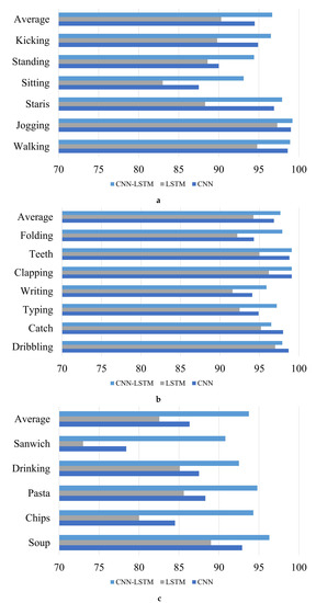 From the results in Table 4, the proposed CNN-LSTM model outperforms the other DL models in every activity. Though when analyzing the performance metrics recognition with accuracy, precision, recall, and F-measure, results of F-measure metric is only presented because they incorporate accuracy and precision. The confusion matrix for the proposed CNN-LSTM networks is shown in Table 5. Because of focusing on the comparison of different activities in this research, F-measure is chosen as the performance metric for this objective. Moreover, we can compare the effectiveness of the CNN-LSTM with the F-measure of each category of activities. The F-measure results of the different DL models trained from smartwatch sensor data are shown in Figure 11.