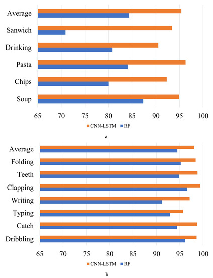 The previous work [27] uses hand-crafted features on conventional machine learning methods (decision tree and k-nearest neighbor) or an ensemble learning (random forest). The results of this work indicated that the random forest (RF) is more outperform than others. So, the proposed CNN-LSTM model is used to compared with existing trained models by the same smartwatch dataset. The comparative results is summarized in Table 7. The proposed CNN-LSTM can improve the accuracy in every scenario in the combination of sensor data. Generally, the proposed CNN-LSTM model outperform others in the conducted experiments. It is because CNN-LSTM has efficiency at dealing with complicated time series problems. Comparison performance results of the eating activity and general activity between the previous work and the proposed CNN-LSTM model can be shown in Figure 12.