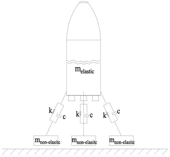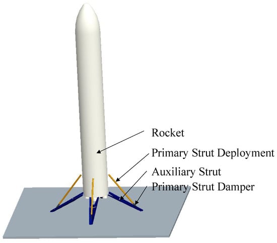 Based on the working principles and control approach of the proposed RLV landing system, its landing dynamic model is required to design the detailed structures. The RLV is composed of an elastic part and four non-elastic parts, as shown in Figure 5. The elastic part includes the rocket, four primary strut deployments, and cylinders of four primary strut dampers. The non-elastic parts include piston rods of four primary strut dampers, four auxiliary struts, and four pads []. Due to the RLV being symmetric, a quarter landing dynamic model of the RLV is built, as shown in Figure 6.