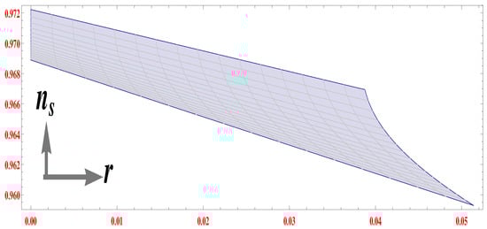 respectively. In absence of the KR field, the becomes and the tensor to scalar ratio gets the expression as . However the presence of the KR field modifies and r by the term proportional to . With the above expressions of and r, we can confront the model with the Planck results which put constraints as and . It may be observed from Equations (39) and (40) that in the present context, the spectral index and the tensor-to-scalar ratio depend on the dimensionless parameters and . For the model in hand, the and r become simultaneously compatible with the Planck results for the parametric regime: and . The simultaneous compatibility of and r is plotted in Figure 2. With and , the duration of inflation comes as if the mass parameter is taken as in reduced Planckian unit. With this value of m, we calculate the number of e-foldings numerically and finally lands with (for ).