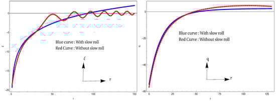 As mentioned earlier, in order to validate the model with the Planck constraints, the maximum allowed value of the parameter . Considering (in reduced Planckian unit), one easily gets . Recall, the energy density of the KR field in the F(R) model is given by (at the point of horizon crossing) and thus the present model along with the Planck observations give an upper bound of the KR field energy density in the early universe as (). Despite this amount of initial energy density, the KR field has practically no observable signatures in the present universe. Thus it is important to explain how the KR field energy density (starting with from the early universe) gets suppressed and leads to a negligible footprint on the present universe and to explain this phenomena, what we need is the expression of the KR field energy density in the F(R) model, which is given by . The solutions of and obtained earlier are based on the slow roll conditions, however to address the effect of the KR field in the present universe, the late time behaviour of and are required, where the slow roll conditions may not valid. Keeping this in mind, we relax the slow roll assumptions and solve the field equations numerically for and (in particular the plot is given for the deceleration parameter ), as shown in Figure 3 by using the relation of (see Equation (31)). Figure 3 demonstrates that the plotted result of based on solving the slow roll equations and the plotted result of based on solving the full Friedmann equations are almost same during the inflation. But after the inflation the acceleration term of starts to contribute and as a result the two solutions (with and without slow roll conditions) differ from each other. Similar argument holds for the deceleration parameter. These numerical solutions immediately lead to the evolution of the KR field energy density in the F(R) model, as shown in Figure 4.