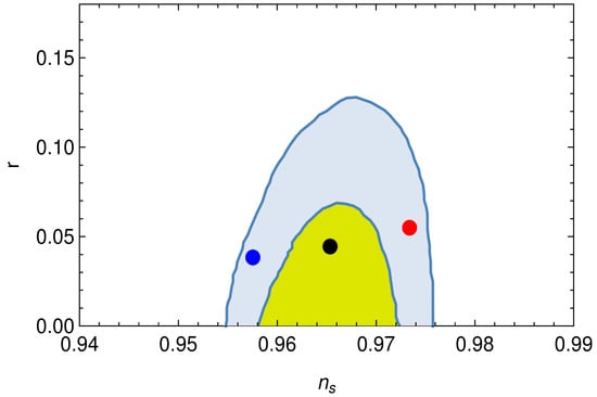 (yellow) and (light blue) contours for Planck 2018 results [], on plane. Additionally, we present the predictions of the present bounce scenario with (blue point), (black point) and (red point).