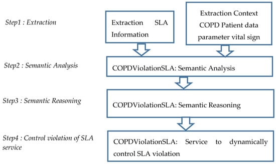 Telemonitoring is an essential activity, not only to improve the quality of life of COPD patients, but also to help emergency physicians make monitoring decisions with real-time data. Today, we are experiencing the emergence of several remote monitoring systems for COPD patients. As these systems are extremely important to the health of COPD patients and the quality of care, QoS must be assessed [,]. Our proposal is based on a virtual dynamic SLA template that monitors the patient context and updates the violation control interface. According to [], the SLA is the main document that guarantees the QoS provided by a computer system. It defines a service level agreement between the IT service provider and the consumer of these IT services. Kritikos et al. [] argued that an SLA comprises a set of service levels (SLs) explicating the different performance behaviors that a service can exhibit. The different activities in the life cycle of an SLA are description, matchmaking, negotiating, monitoring, assessment, settlement, and archiving []. Different languages are used to design and implement the SLA. The structure of the SLA document in Web Service Agreement( WSA) format allows us to translate the SLA document into an XML file. In this XML file, we can easily extract the data with another XML-compatible language. Our approach, described in Figure 1, is based on a WSA format in an XML-compatible language. Figure 1 describes our approach to design dynamic control mechanisms for SLA in a COPD monitoring context. Indeed, our approach consists of the four steps described below.