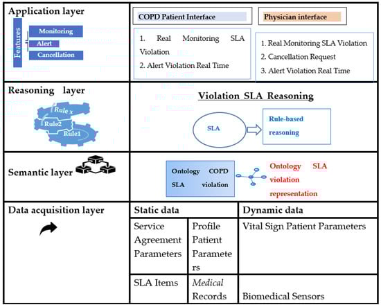 During the last few decades, ubiquitous computing, particularly Health Care System and Health Information Technology (HIT), commonly referred to as pervasive/ubiquitous systems, has impacted the world of research. This revolution has materialized through many context-aware applications that have become important in different fields of research in general, and particularly in the medical field. Health Information Technology (HIT) is health technology, particularly information technology, applied to health and health care. It supports health information management across computerized systems and the secure exchange of health information between consumers, providers, payers, and quality monitors. Service level agreement (SLA) was introduced in the 1980. SLA has been used in various fields such as telecommunications, call centers, security, cloud computing and health systems. In effect, remote medical monitoring platforms manipulate large volumes [] of patient data, and the risk of data loss or poor data quality is real. This situation can be dangerous for chronic obstructive pulmonary disease (COPD) patients in extremely exacerbated cases. Moreover, quality of service (QoS) is important in the field of monitoring systems because context-aware applications must constantly adapt their services to the context []. The context changes dynamically, and meeting QoS requirements is a challenge. Tamura et al. [] explained that the necessity to meet the quality level requirements of the platforms in variable execution contexts is a major problem. Context-aware applications must constantly adapt their services to the changing context. The question is how to dynamically monitor the service level agreement (SLA) during an adaptation activity in which the context can be changed. Abawajy et al. [] state that an SLA document includes negotiable information and unnegotiable constraints. In SLA models, we can identify standard types of metric groupings, such as platform performance metrics, hardware performance metrics, and software performance metrics. Khattak argues that context quality of service (CQoS) errors [], which can occur at any stage of the adaptation process, can have an impact on the quality of service provided by contextual applications. Khattak [] et al., declared that the contextual data fusion is performed from several sensor sources. However, these sensors may have problems of erroneous reading and connection failure. As a result of data acquisition errors and failures, sensors can provide erroneous data. At the inference level, the algorithms on which the calculations are based may be erroneous. All these situations can cause violations of the SLAs between the providers of context-aware applications and users or customers. It is therefore important to have mechanisms to continuously control and improve the quality of service (QoS) on these platforms. Research associated with SLAs for cloud computing is increasing, but in the context of health monitoring, especially in the context of health surveillance, the dynamic QoS control mechanisms of monitoring platforms are not fully addressed []. In this article, we propose an ontology that uses SLA information from COPD monitoring platforms with dynamic data from the patient context. The purpose of this article is to propose a dynamic mechanism for evaluating SLA violations. The solution allows us to retrieve the main items from SLA based XML documents and then retrieve the COPD patient context data dynamically from a COPD SLA ontology. These data retrieved in real time allow the calculation of key performance indicator (KPI) targets based on service level objective (SLO). The adaptive SLA model displays the result of SLA control. This model is available on supplier and consumer interfaces in real time. The information on the interface for SLA control changes dynamically depending on the context-aware system data and the SLA document data. The SLA parties can dynamically control their KPI targets. Our solution can be also deployed on different COPD patient monitoring systems in the application layer to integrate quality control mechanisms. This paper presents our adaptive mechanism model to better control SLA violations in the context of monitoring COPD patients. The structure of the article is organized as follows: Section 2 describes related works, Section 3 presents the proposed model, Section 4 describes the design of the virtual adaptive template SLA and its implementation, and Section 5 presents the conclusion and future works.