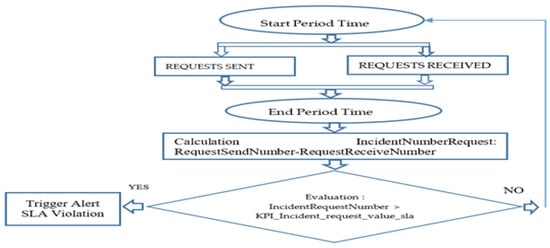Concerning request incidents, the incident counter (IncidentRequestNumber) is calculated as the difference between the number of incidents (RequestSendNumber) sent to the emergency physician by patients and the number of requests (RequestReceiveNumber) confirmed or received by the emergency physician during period. The system then compares the KPI_IncidentRequestValue extracted from the SLA to the IncidentRequestNumber. If IncidentRequestNumber > KPI_IncidentRequestValue, then a QoS SLA violation alert is triggered. All these mechanisms are implemented in the SLA violation algorithm. This algorithm represents the core of the system’s reasoning. Below, Figure 4 describes the algorithm of SLA violation mechanisms based on incident requests.